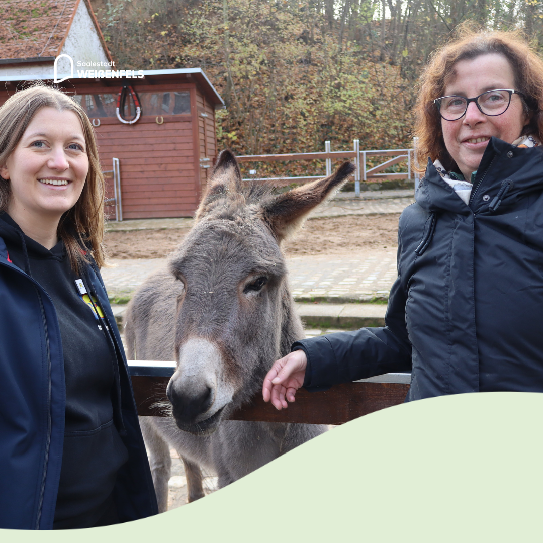 In dem Eselgehege leben momentan zwei Eselinnen. Paula kam 2022 aus dem Wildpark Daun in der Eifel, Lilly wurde 2006 im Weißenfelser Heimatnaturgarten geboren. Beide gehören zur Rasse der Thüringer Waldesel.